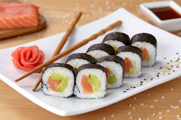Sushi roll with rice, nori, creamy avocado and fresh, raw salmon.