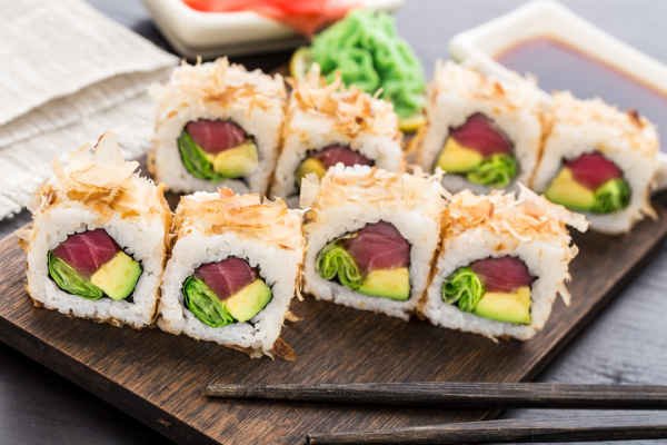 Sushi roll with rice, nori, creamy avocado and fresh, raw tuna.