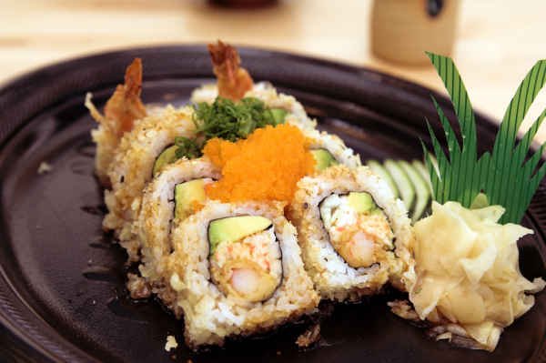 Shrimp tempura is a rice and nori sushi roll, stuffed with tempura battered shrimp, cucumber and served with Japanese Mayonnaise.
