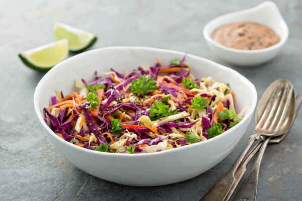Green salad with ginger dressing is composed of lettuce and assorted veggies, served with a zesty ginger dressing.